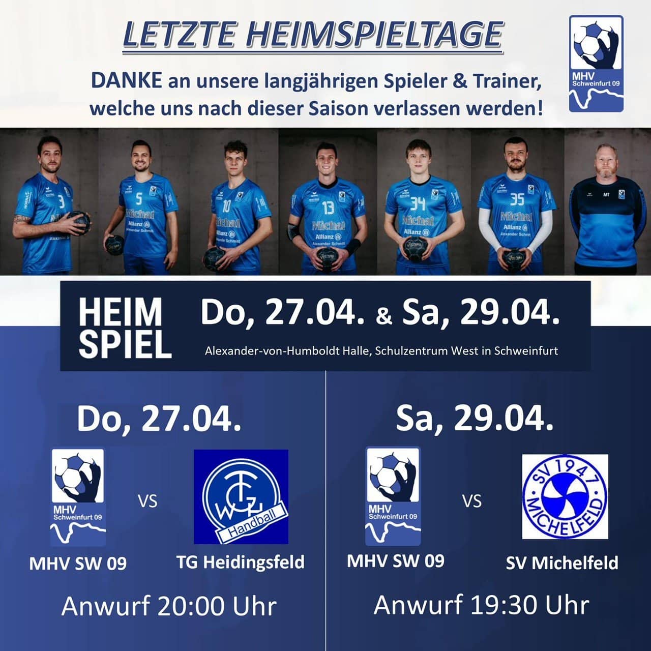 Es steht die zweite englische Woche in Folge für unsere MHV Herren an! Am kommenden Donnerstag trifft man zu Hause auf die TG Heidingsfeld, ehe man am Samstag zum Saisonabschluss die SV Michelfeld empfängt! 💪🏼
